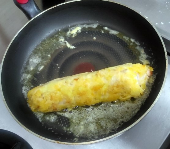 고정시키기 위해 먼저 팬에 겉면만 익혀요. 갈색을 좀 내주고