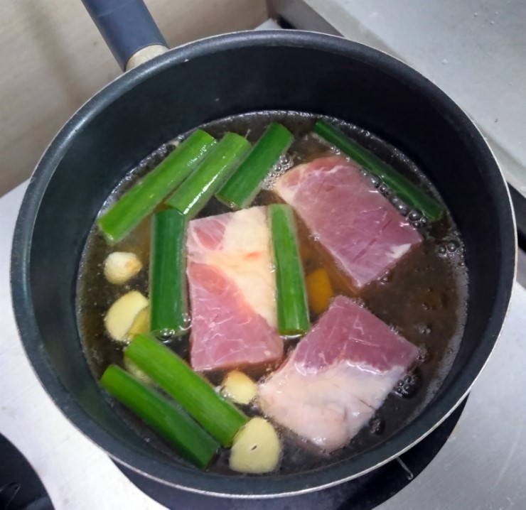 커피도 넣고 맥주가 끓으면 핏물을 뺀 삼겹살을 넣어 삶습니다.